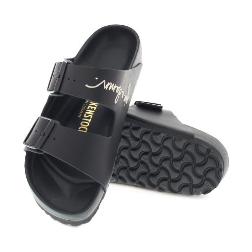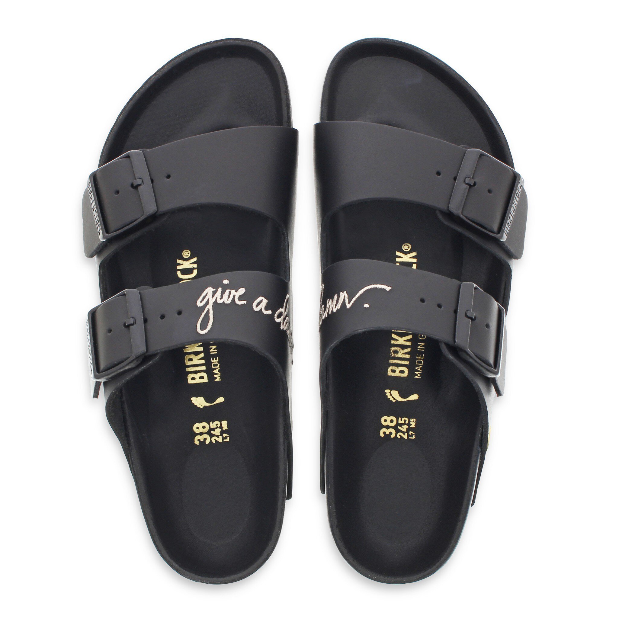 BIRKENSTOCK® x Lingua Franca. The New York luxury brand brings its timeless “Give a Damn” message to limited edition Arizona sandals. The brand’s signature script embroidery makes a statement across each strap so you can take that spirit with you. Smooth leather footbed linings add a luxe touch below, grounding you in legendary comfort. Tonal soles and buckles refine the details.