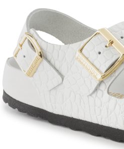 The BIRKENSTOCK Milano now features a reptile leather look and feel and a compact design with an ankle strap. The metal pin buckles are individually adjustable with color-coordinated detailing. The exquisite footbed is fully lined with soft piumato leather, making it exceptionally comfortable. The upper is made from embossed natural leather.